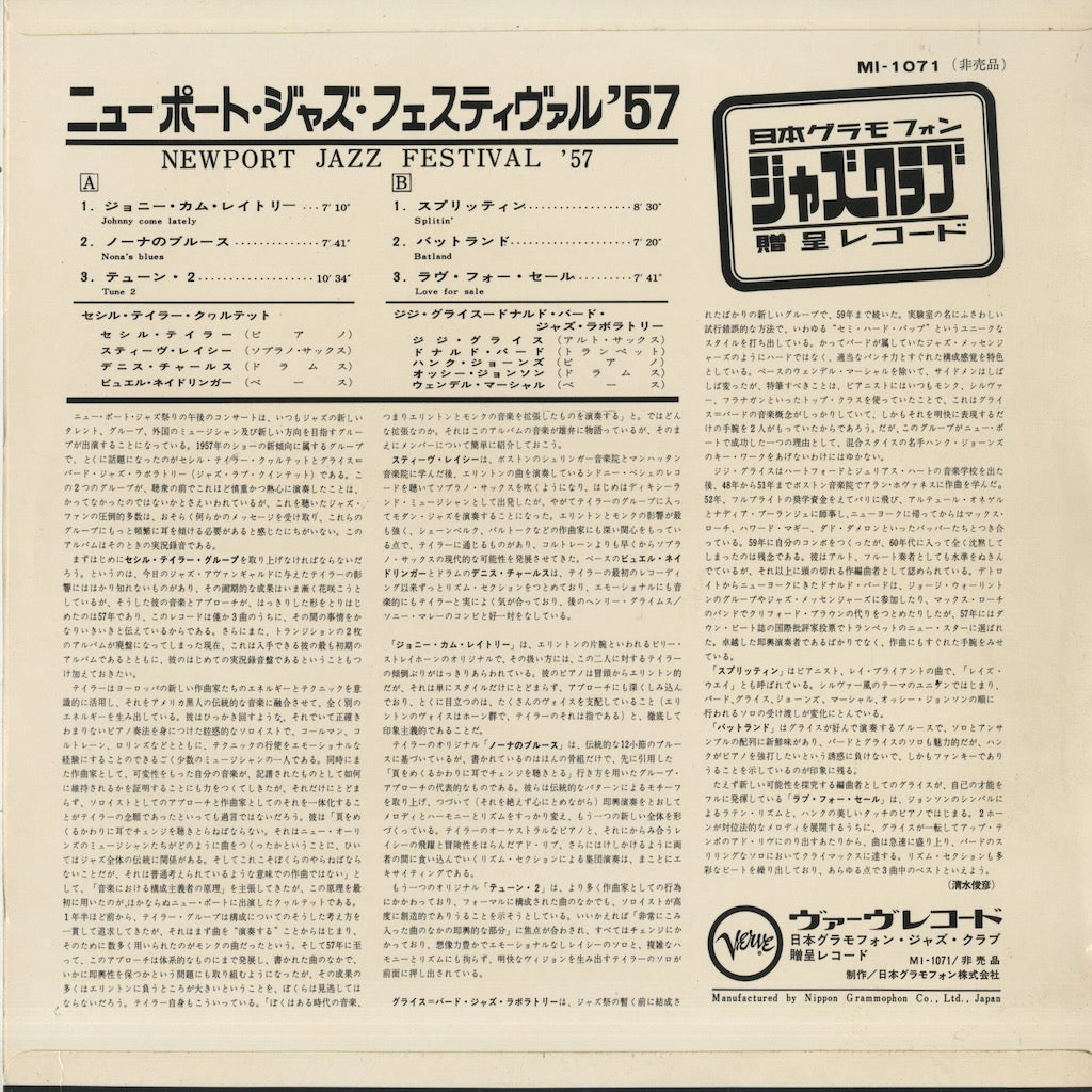 A面にはセシル・テイラー・カルテットによる演奏、B面にはジジ・グライス&ドナルド・バードのコンボ演奏を収録。57年に行われたニューポート・ジャズ・フェスティバルでの録音です。(VPI cleaned)