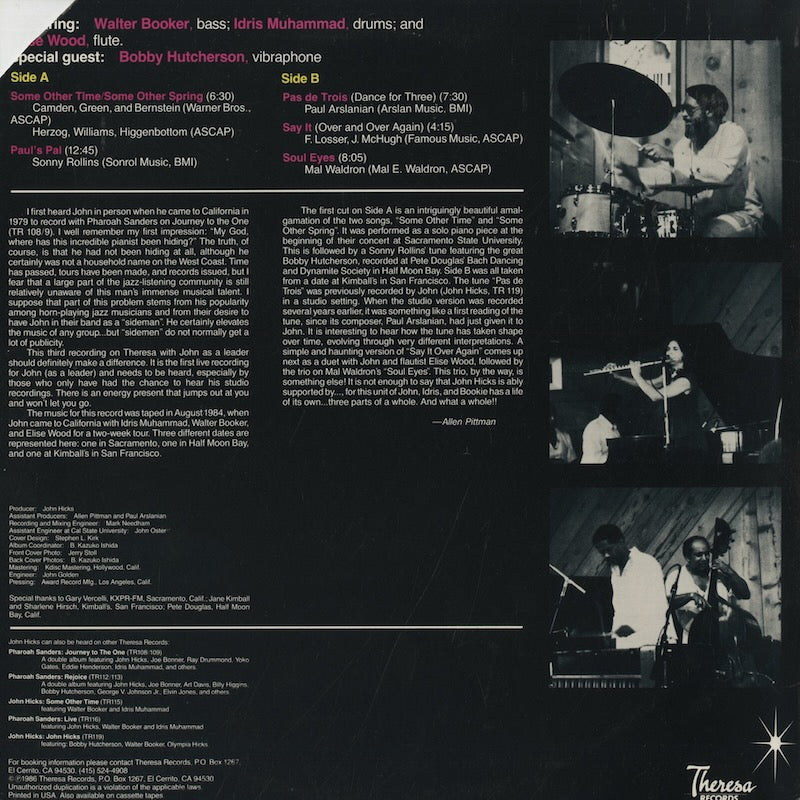 w./ ワルター・ブッカー(b)、イドリス・ムハマド(ds)、ボビー・ハッチャーソン(vib)、ファラオ・サンダースの傑作アルバム"Joureney To The One"に参加していたピアニストのリーダー作。リリカルなタッチが堪能できる静かに熱い美麗チューン"Pas De Trois"が最高!(VPI cleaned)