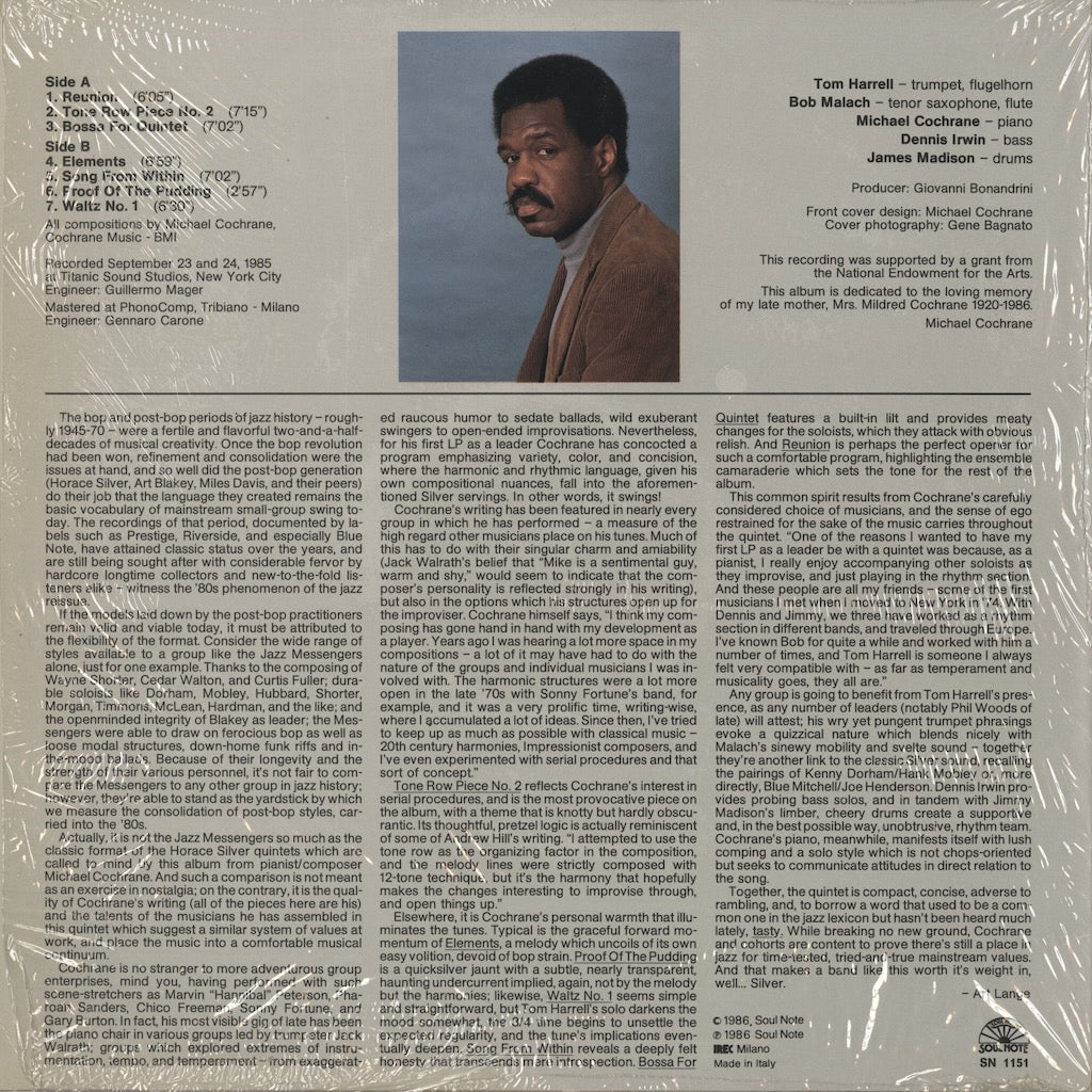86年発表。イタリアはSoulNoteからリリースされていた素晴らしいアルバム。ピアニスト、マイケル・コクランをリーダーとしたクインテットによる洗練されたモーダルな演奏。"Bossa For Quintet"、"Proof Of Pudding"が特にオススメ。(VPI cleaned)