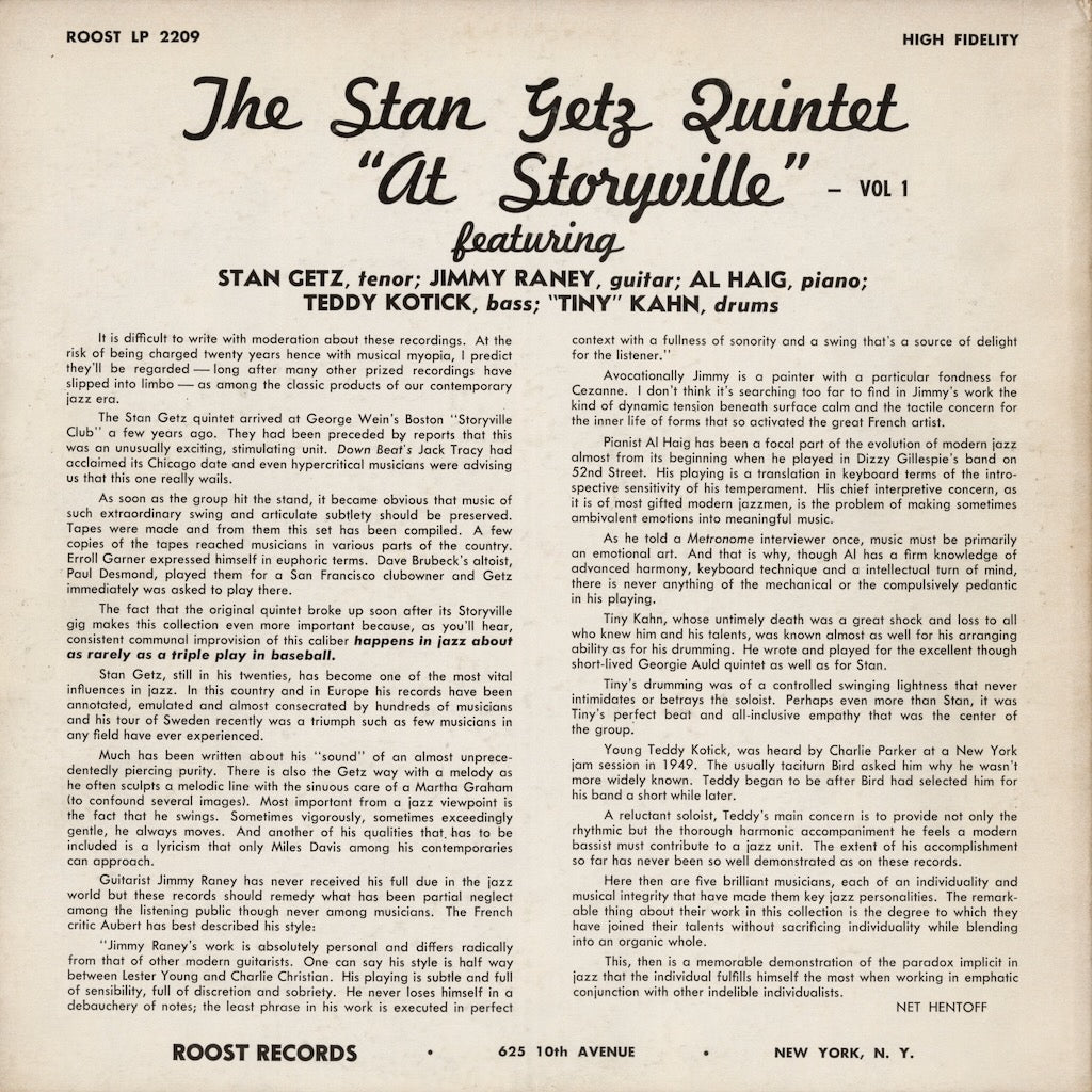 w./ジミー・レイニー、アル・ヘイグ、テディー・コティック、タイニー・カーン//51年、ボストンはStoryvilleでのライヴ録音。ギターのジミー・レイニー含むクインテットでの作品。創造性の絶頂にあったゲッツのプレイが堪能できる名盤。(VPI cleaned)