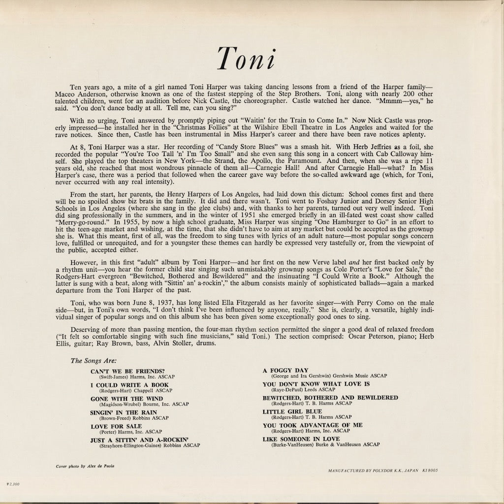 w./Oscar Peterson(p) Herb Ellis(g) Ray Brown(b) Alvin Stoller(ds) // 若き女性ジャズ・シンガー、トニ・ハーパーが残したアルバム。当時18歳とは思えぬ柔らかく透明感のある歌声でスタンダードを丁寧に歌い上げ、落ち着いたムードの中に瑞々しさを感じさせる。上品で親密な雰囲気が魅力のヴォーカル作品。(VPI cleaned)