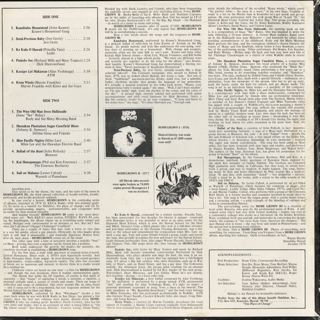 78年発表。ハワイをベースに活動したローカル・アーティストの曲を収録した名作コンピ第三集。「Hawaiian Breaks」にも収録されていた、ポエトリー・リーディングをフィーチャーしたジャジー・チューン"Kona Winds"など収録!コンテンポラリー・ハワイアン好きならハズせない一枚!(VPI cleaned) *レーベル両面に書き込みあり・背ダメージ・上辺2/3割れ・下辺中央部5.5cmの割れ